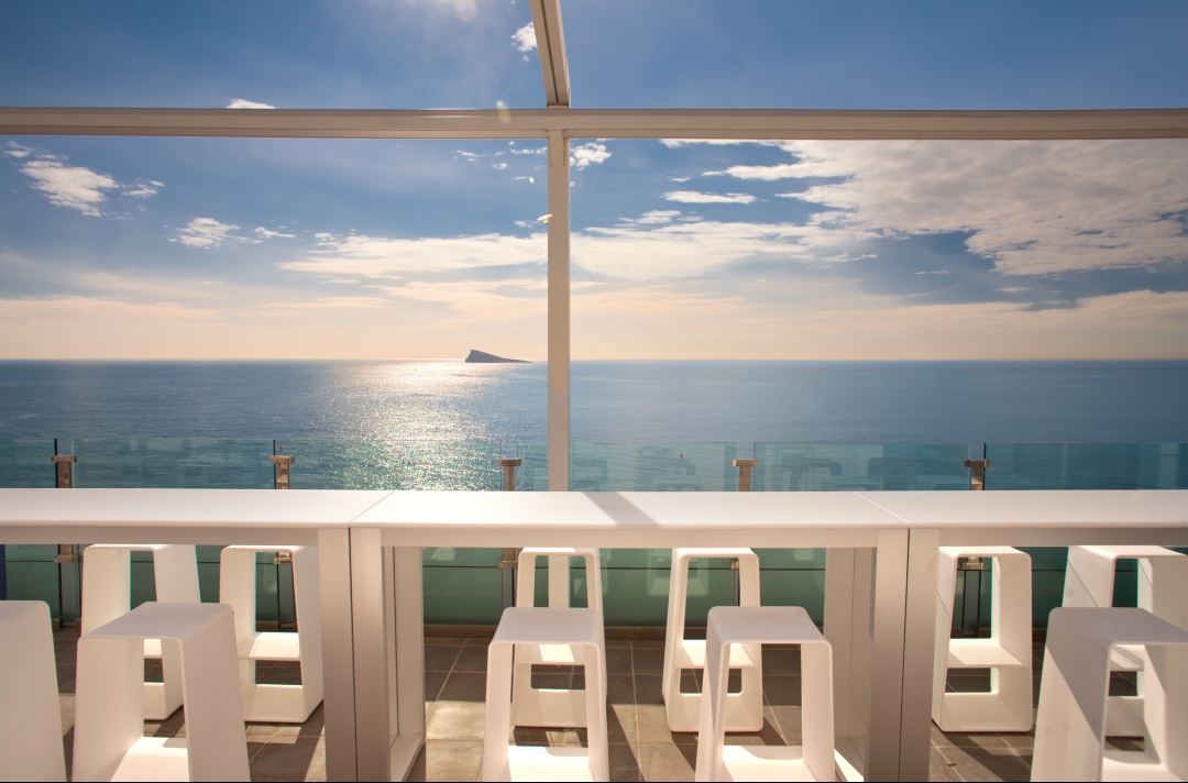 Terrasse avec vue panoramique sur la mer Méditerranée et l'horizon de Benidorm. Idéal pour un cocktail spécial et inoubliable.